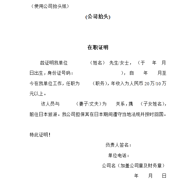 ★在职证明原件(模板见以下,格式内容可适当更改),需注明姓名、入职日期、职位、年收入10万以上,加盖公章或财务章或人事章,由相关负责人签字;如是公司法人,请额外提供营业执照复印件;如是自由职业或者非工作收入来源的,则无需提供在职证明